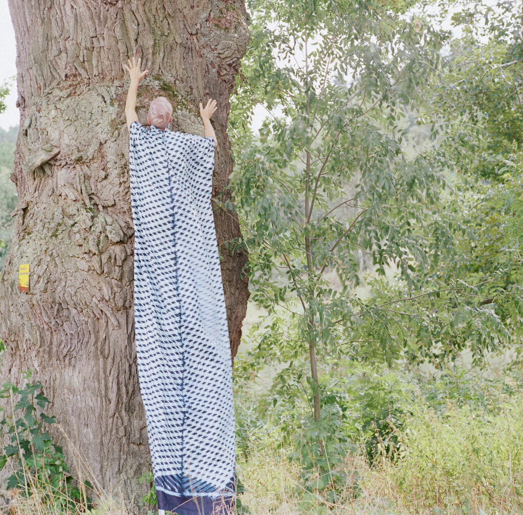 This Adire textile came to me from Adedoyin Faniyi via our mutual friend Marion Steiner, with a word attached to it in a drawn-written way on a sticky note: “Sliding.” After a very long time, I gathered the courage to cut into these meters of white-to-blue. I cut only one hole, through which my head would go. From there, I stitched the fabric into a dress that tries to honor its name—by dots, not lines. I kept the cut-out piece in case I decide to make the textile whole again.