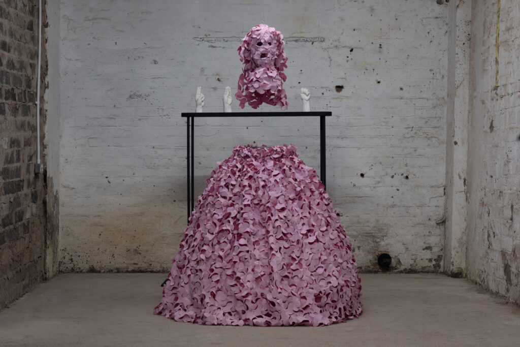 Part II (Pink Figure), 2023 / 2025 Camouflage Net, Linen Thread, Steel, Synthetic Textile 185 x 130 x 130 cm